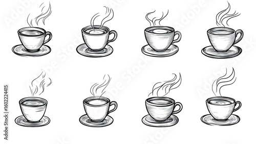 Title: Minimalist Black and White Illustration of Steaming Hot Coffee Cup Isolated on White Background