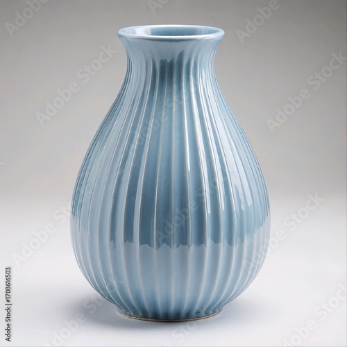 Title: Blue ceramic vase with teardrop shape and vertical grooves