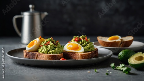 Toast with guacamole and boiled egg, centered on a gray ceramic plate