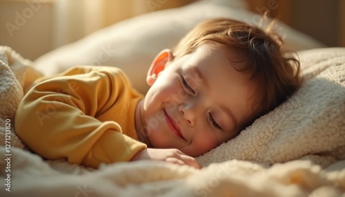 Toddler smiles sleeping on a soft pillow and cozy white blanket. Dreamy kid sleeps soundly at home in morning sunshine. Child is lying on bed with teddy bear toy.