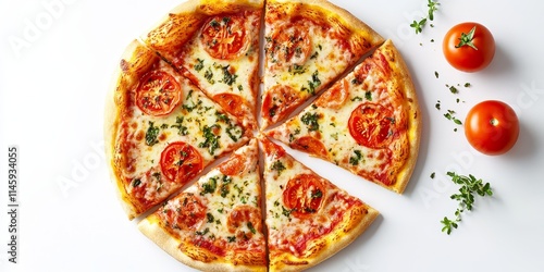 Tomato pizza with delicious pizza pieces displayed on a clean white background, showcasing the irresistible appeal of tomato pizza and its perfect pizza pieces for food lovers.