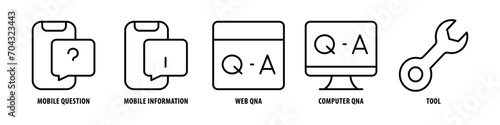 Tool, Computer QnA, Web QnA, Mobile Information, Mobile Question editable stroke outline icons set isolated on white background flat vector illustration.
