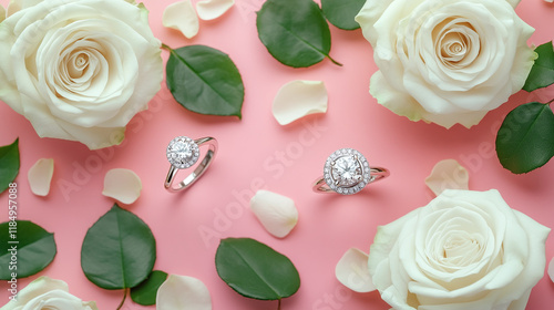 Top or above view of white roses and two engagement rings on pastel pink background. romantic wedding jewelry background, luxury marriage celebration, love relationship commitment occasion or event