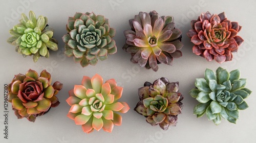 Top View Collection of Eight Colorful Echeveria Succulent Rosettes on Light Background