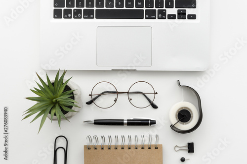 Top view desk with office supplies
