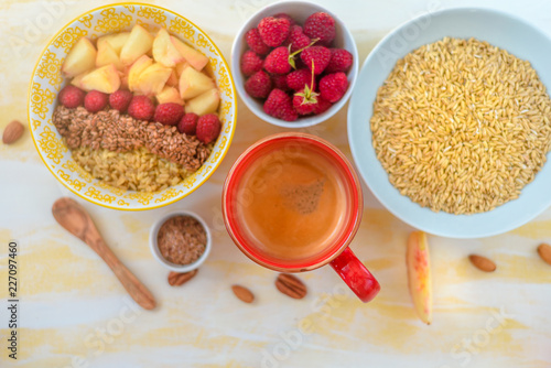 Top view, female hands holding a cup of coffee, a spoon with oatmeal, with honey nuts, raspberries, on a yellow wooden table Good morning - healthy breakfast background