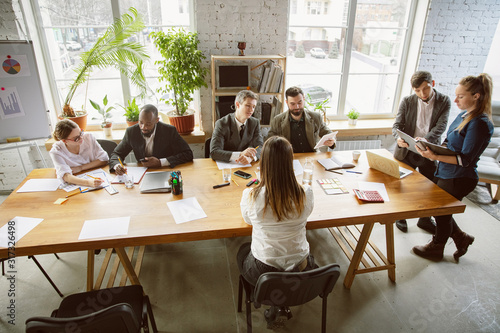 Top view. Group of young business professionals having a meeting. Diverse group of coworkers discuss new decisions, plans, results, strategy. Creativity, workplace, business, finance, teamwork.