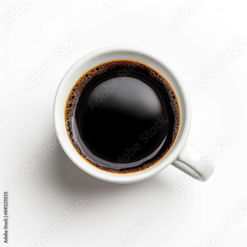 Top view of a freshly brewed cup of black coffee on a bright background, symbolizing a refreshing start to a summer morning with energy and productivity