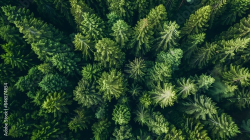 Top view of a pine forest. Cinematic drone view forest, Green background