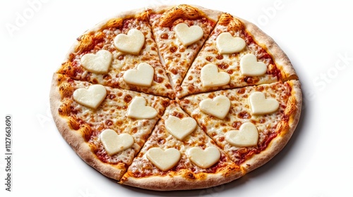 Top view of a pizza with heart-shaped cheese toppings, vibrant and crispy crust, isolated on a pure white background, ideal for romantic food concepts