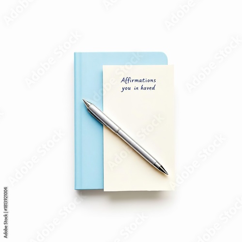 Top view of a silver pen resting diagonally across a creamcolored note card with handwritten text, placed over a light blue notebook, isolated on white background