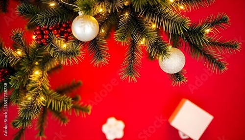 top view of decorated Christmas tree on red background