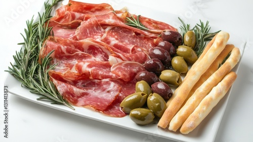 Top view of Italian antipasto platter with thin slices
