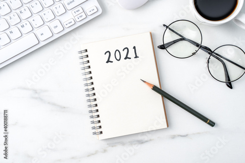 Top view of office table desk 2021 Goal work concept on bright marble white background.