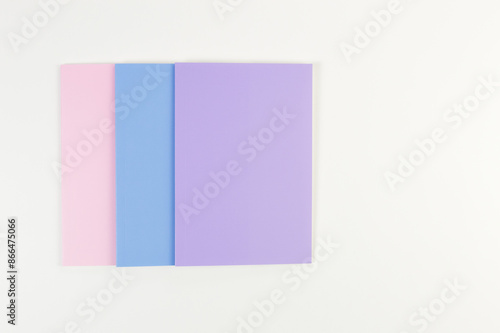 Top view of pink, purple and blue notebooks on white background. School, office wallpaper. Flat lay, copy space.