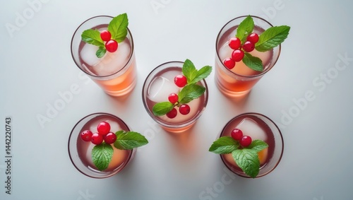 Top view of summer fruit and berry iced tea in glasses. Space available for text.