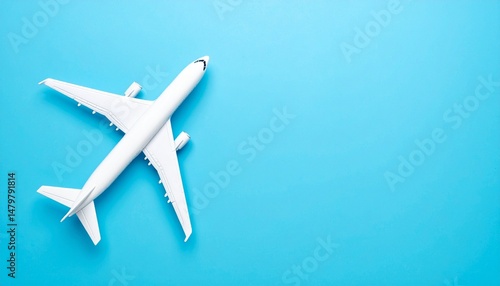 Top view of white commercial passenger airline airplane jet on blue background with copy space. Transportation tourism travel aviation and business concept