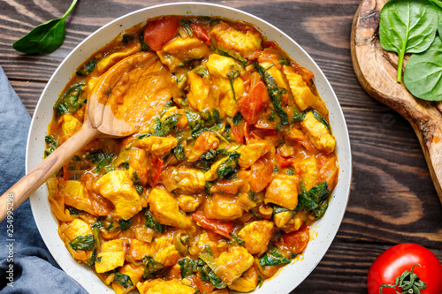 Top view on Bombay chicken curry with spinach, tomato and onion in a white frying pan on a kitchen wooden table. Indian traditional cuisine.
