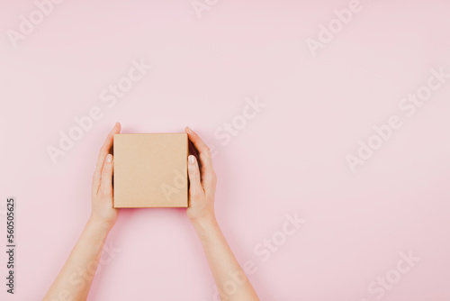 Top view to female hands holding small rectangle brown cardboard box on pastel pink background. Mockup parcel box. Packaging, shopping, delivery concept