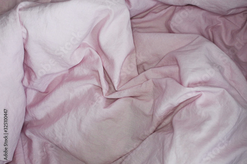 Top view with crumpled pink bed sheet. Cotton textile waved.