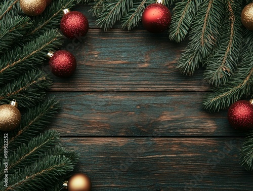 Top view Wooden background with branches of christmas tree with Christmas balls.
