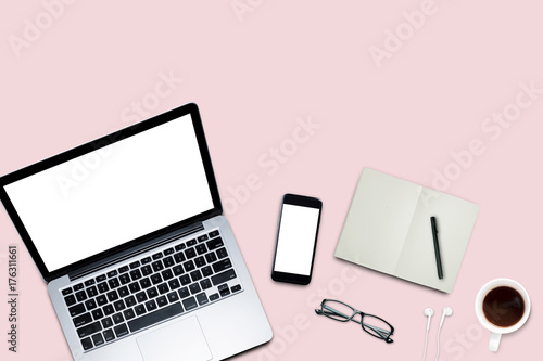 Top view, Working desk, computer, laptop, smart phone, coffee mug, glasses and notebooks on pastel color background with copyspace for text.