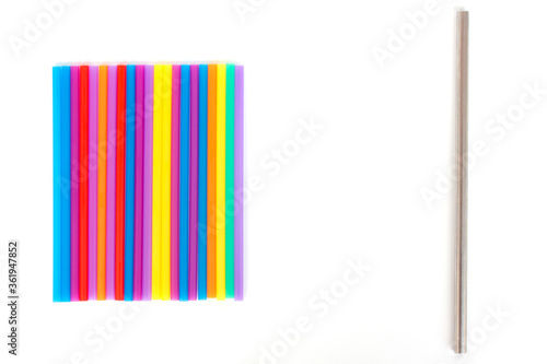 Top view. Zero waste concept. plastic vs eco steel straw. one reusable sustainable cocktail metal straw and multiplicity multi-colored plastic straws on white bckground. Choose metal straw in bar.