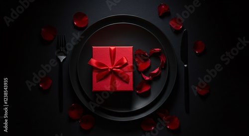 Top-down shot of a modern Valentine arrangement geometric black plates, a bold red gift box21