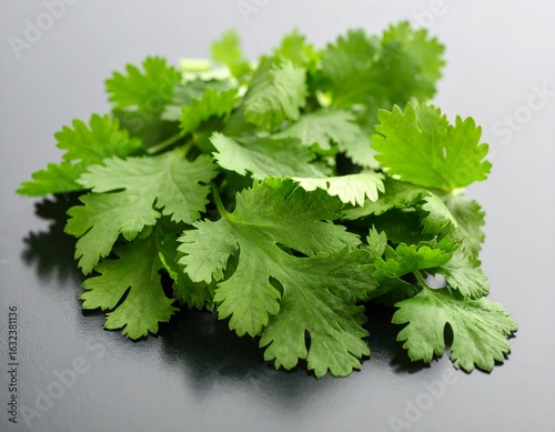 Top-down view of coriander leaves loosely layered on a glossy dark surface