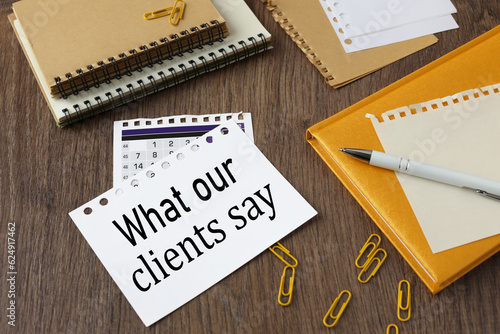 torn page on the calendar on the table. yellow notepad. words What Our Clients Say