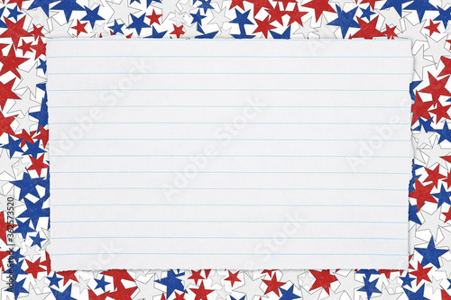 Torn piece of white notepad paper with lines on red, white and blue stars paper background