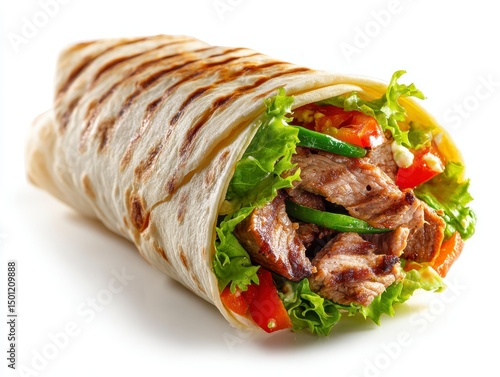 Tortilla wrap with grilled meat, vegetables and lettuce on white background