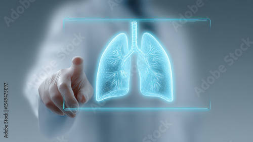 Touch of Healing: A close-up shot showing a doctor's precise touch interacting with a glowing, futuristic representation of human lungs, highlighting health and innovation.