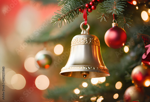 Touches of Grandeur: The Golden Bell Capturing Eyes with Its Notable Shine and Red Bow in a Festive Setting.