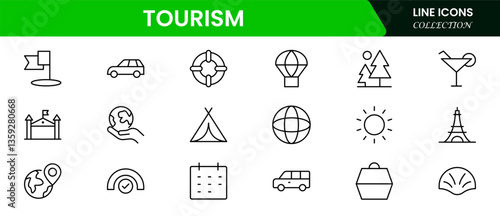 Tourism icon set. Airplane, trip, beach, passport, summer vacations, luggage, camping, hotel. Collection of traveling and tourism elements. Vector illustration.