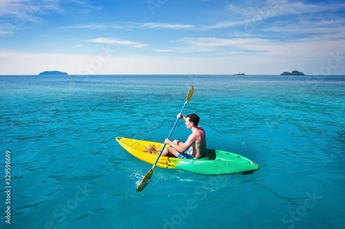 tourist paddling on kayak in tropical sea, beach travel leisure, active tourism and kayaking
