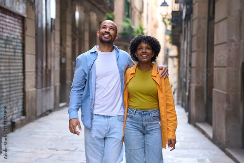 Tourists couple walking and admiring barcelona city