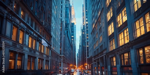 Towering Cityscape with Bustling Financial District and Illuminated Office Buildings at Night