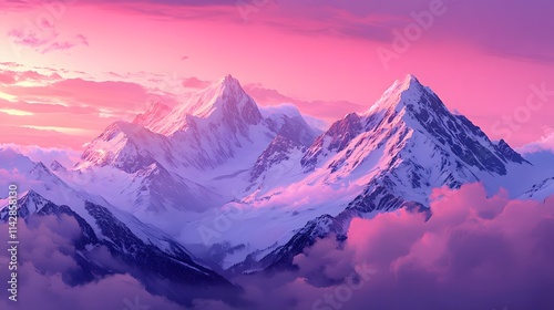 Towering snow covered peak glow in soft pink twilight, surrounded by mist and creating a breathtaking alpine landscape