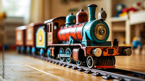 Toy train model, nostalgic mood, on wooden tracks, in a cozy children's room