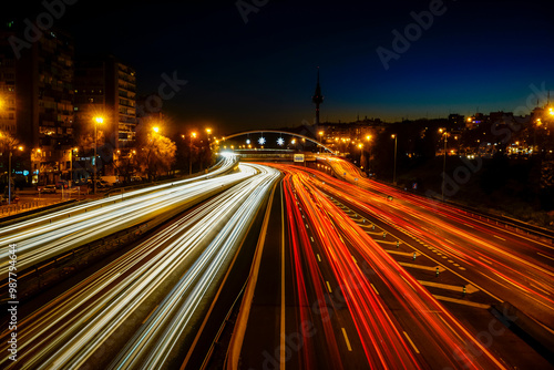 Traces of car lights at dusk driving along the Madrid ring road with the Piruli in the background