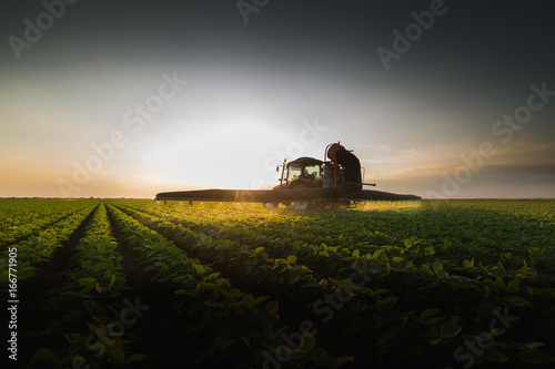 Tractor spraying soybean field at spring