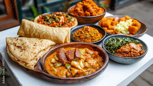 Traditional African food Chapati and assorted dishes including vegetable stew, fried plantains, Jollof rice, and leafy greens. Citrus-colored vegetables and meat are visible.