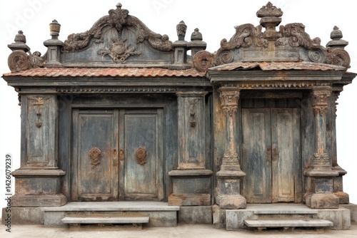 Traditional Balinese architectural structures showcasing intricate carvings and weathered wood in a serene outdoor setting