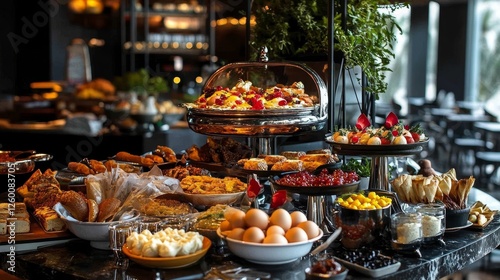 Traditional delicious modern Turkish cuisine. Plain Turkish breakfast with copper-pan egg dishes, pastries such as börek and bagels, jams, olives, cheeses, vegetables and Turkish tea.