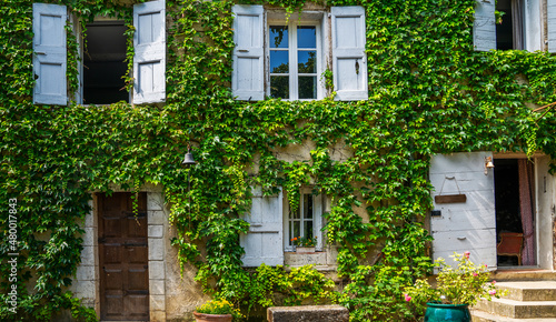 Traditional eco architecture with plants on the facade. Ecology and green environment concept. Stone farmhouse at French Alps. Farmhouse windows with old shabby shutters surrounded by ivy.