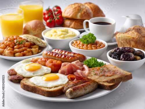 Traditional full english breakfast serving eggs, sausages, bacon, beans