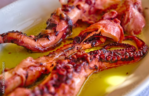 Traditional greek boiled octopus served with oil in white plate.