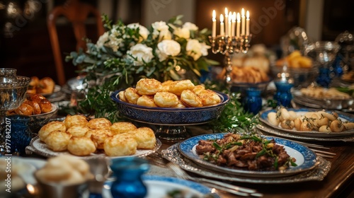 Traditional Hanukkah dinner celebration featuring latkes, sufganiyot, and brisket beautifully arranged on a blue and silver decorated table with a glowing menorah and fresh flowers
