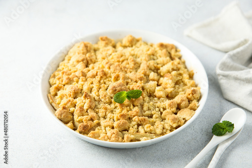 Traditional homemade crumble dessert with fresh mint
